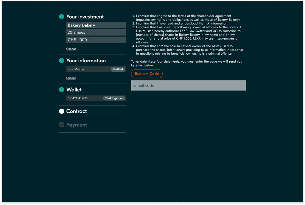 Before you can complete your investment, we need your consent and confirmation that you want to join the company's registeringment, that you are aware of the risks of your investment, that our notary can subscribe the shares on your behalf, and that the money you deposit really belongs to you. To give your consent and confirmation, click on 'Request Code'. You will receive a one-time code on the email address registered with your account. Enter this code in the white field and click on 'Continue'.