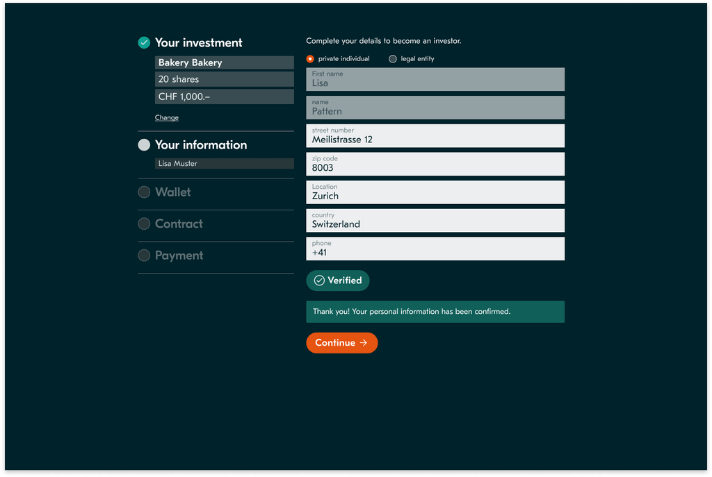 The personal details you entered during registration will appear here. Please check them for accuracy and make changes if necessary. If your verification has already been completed, your status will be green. A grey status means your verification is still being processed. You will be notified by email as soon as the verification process is completed. Either way, you can now proceed with your investment.