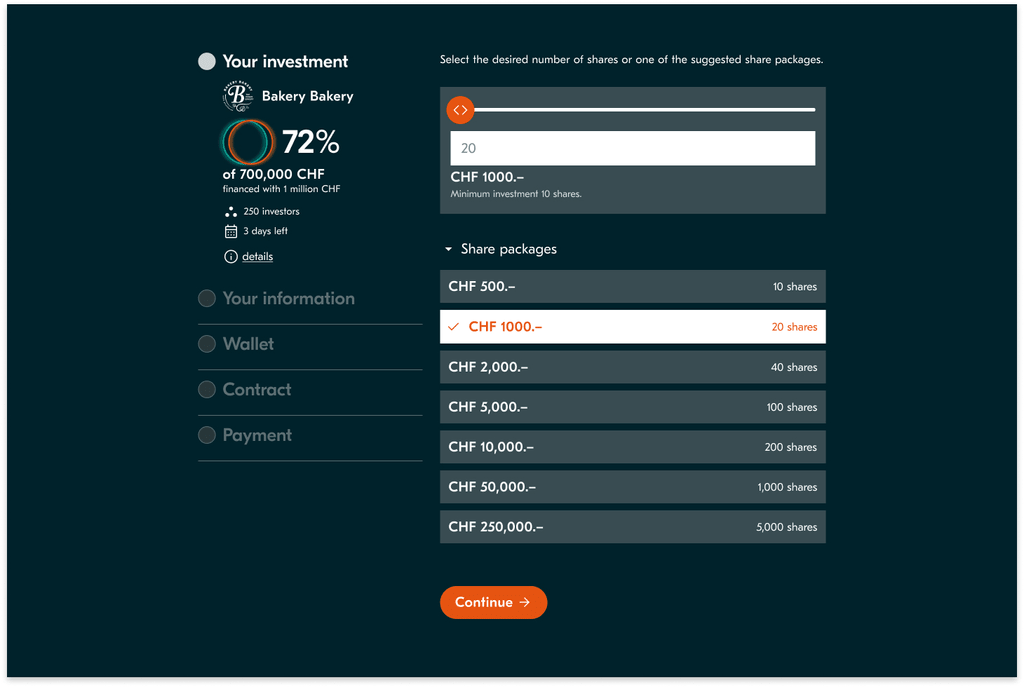 Now, you can select an individual number of shares with the slider or choose one of the share packages. If you’re using the slider and the share packages come with additional services, you will get these services, too, by selecting the minimum number of shares needed for the package. Once you’re done, click 'Continue' to go to the next step.