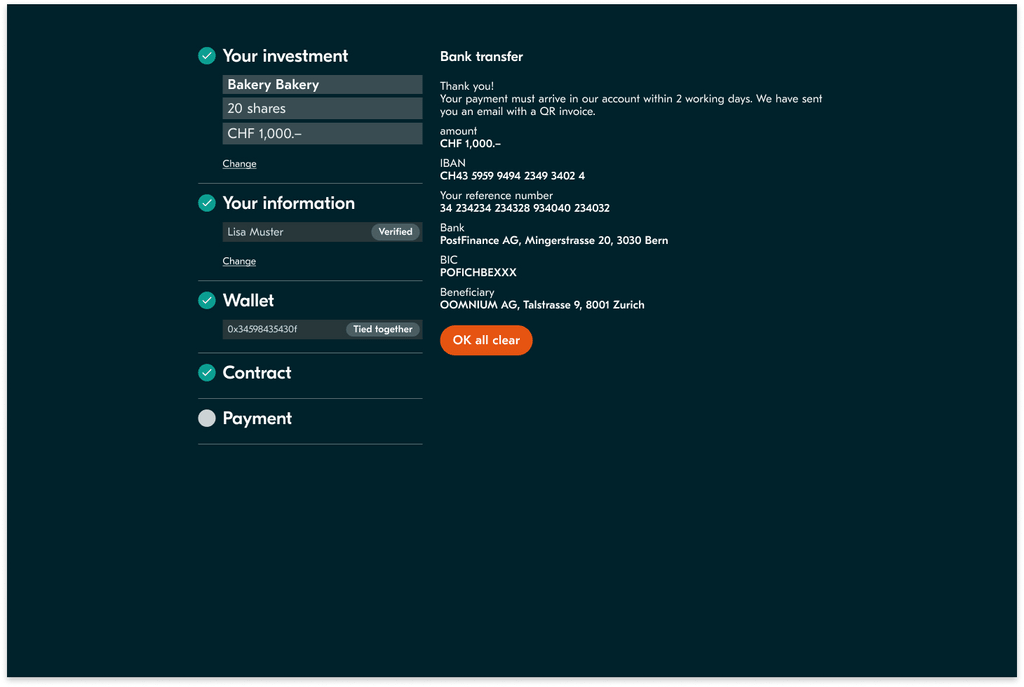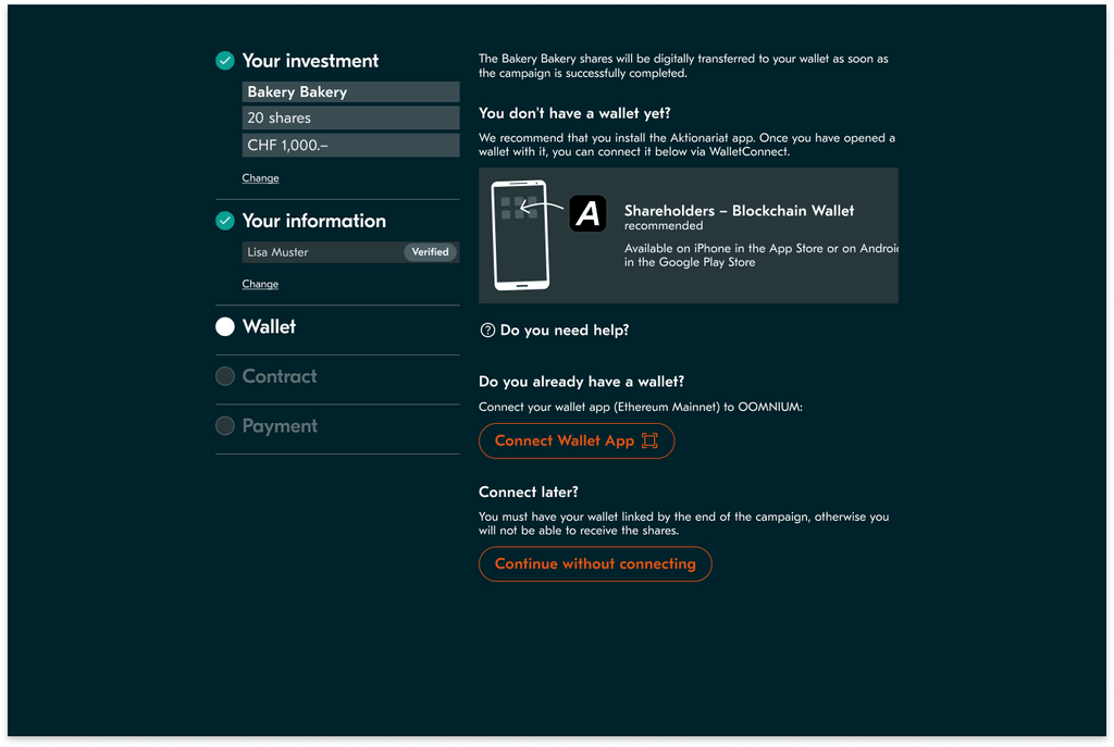Shares on OOMNIUM are digital only. To receive them, you need a suitable wallet. If you already have a wallet, you can easily connect it here. If you do not have a wallet yet, we recommend you download the wallet of our partner Aktionariat and then connect it. Don’t worry, you do not need any money in your wallet to pay for your shares. It will only be used to store your digital shares once you’ve received them.