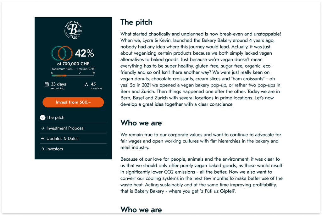 The pitch, the company profile, and the campaign are publicly available. Additionally, registered users can find all the necessary facts and figures to make their decision in the 'Investment Proposal' section. After you have registered on our platform and created your user account, click 'Login' in the top right-hand corner. Inside the black box on the left, you can then click on 'Investment Proposal' to view all available information on your favourite company's campaign.